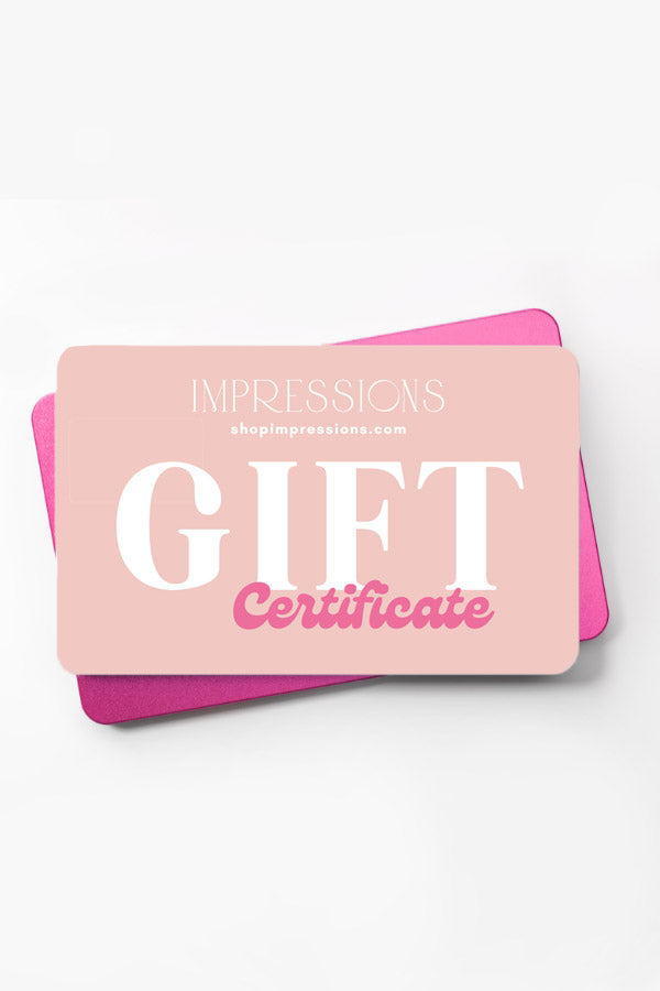 Gift cards are delivered by email and contain instructions to redeem them at checkout. Our gift cards have no additional processing fees. Our gift cards can only be used on shopimpressions.com